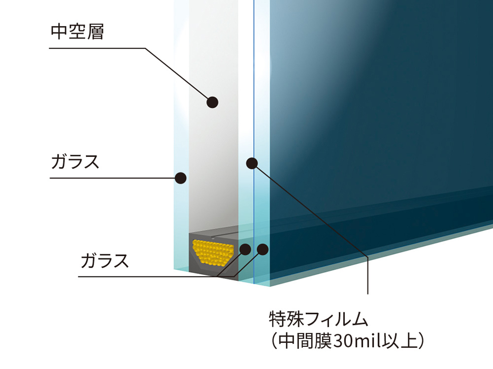 ガラスの間に特殊フィルムを挟み、加工を施した「合わせガラス」を用いた、防犯タイプの複層ガラスのことです。通常の複層ガラスに比べ破壊されにくい構造となっています。