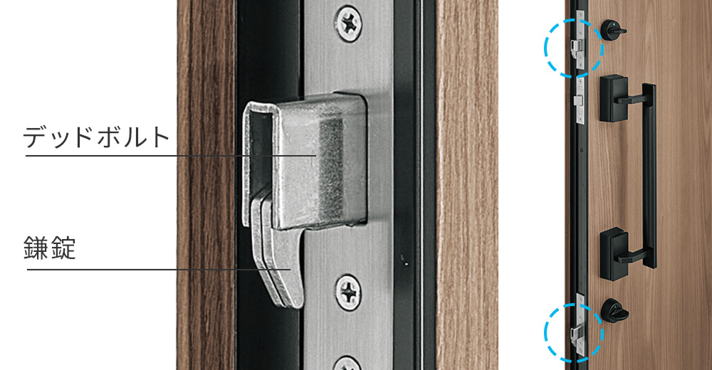 デッドボルトは、上下2箇所に採用しています。こじ開けを防止する鎌式の構造となっています。