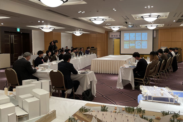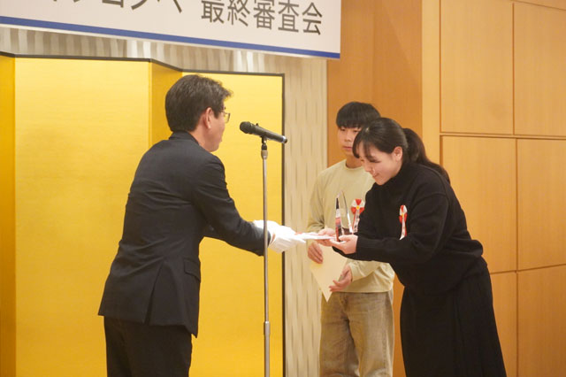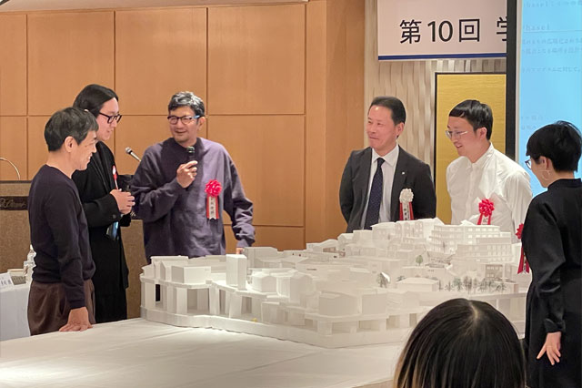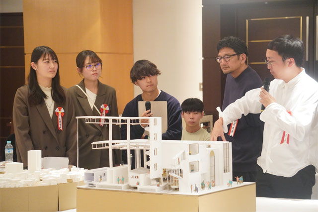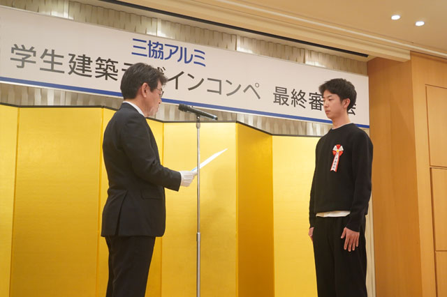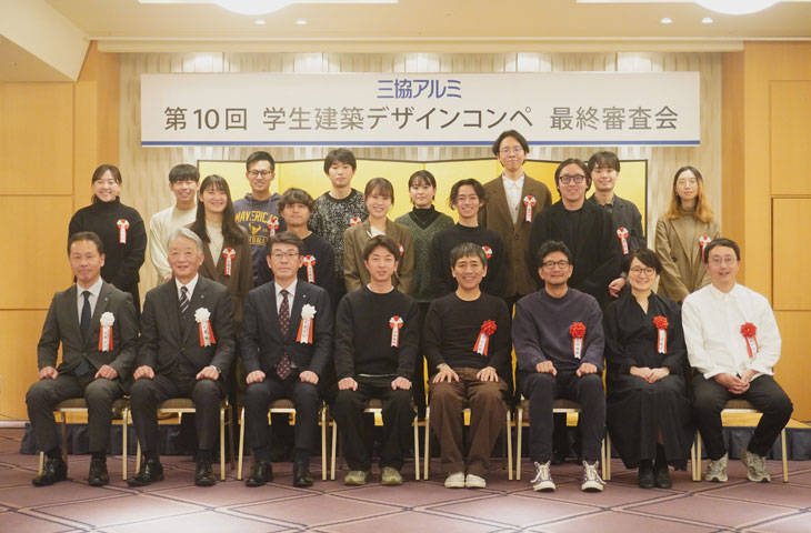 最終審査会では、応募総数145作品の中から1次審査会を通過した8作品の制作者によるプレゼンテーションが行われ、審査員長の西沢立衛先生をはじめ審査員の先生方による公開審査により、最優秀賞1作品、優秀賞3作品、特別賞4作品を決定いたしました。三協アルミ賞は建材提案を応募いただいた24作品の中から、当社の開発部門等による社内審査により、1作品を決定いたしました。表彰式では、9作品の受賞者(15名)に豊岡社長より表彰状と記念品を贈呈いたしました。