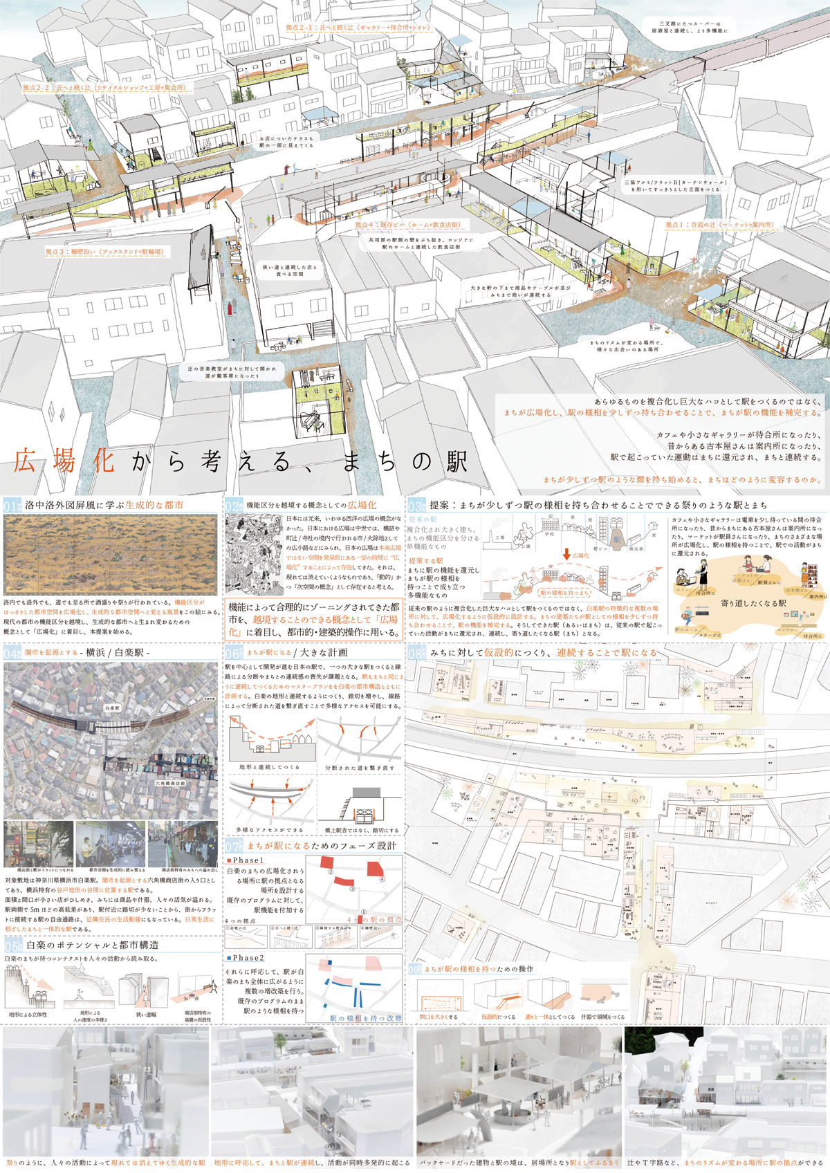 日本は中世よりいわゆる西洋的な広場はなく、道や辻、橋のたもとなどがあるとき広場となることで存在してきた。その動的な運動を広場化と定義する。近代の日本の駅は、街の中心に位置し、さまざまな行為を取り込み複合化することで便利になった。一方で、街と分断され、機能区分が分かれた単機能的な都市を助長したと考えます。機能によって合理的にゾーニングされてきた都市を、越境することのできる概念として「広場化」に着目し、都市的・建築的操作に用いる。大きなハコとして駅を作るのではなく、まちの部分が広場化し、駅の様相を持ち合わせることで、まちが駅の機能を補完する。カフェや小さなギャラリーは電車を少し待っている間の待合所になったり、昔からまちにある古本屋さんは案内所になったり、マーケットが駅員さんになったり、駅で起こっていた活動はまちに還元され、連続し、寄り道したくなる駅(あるいはまち)となる。