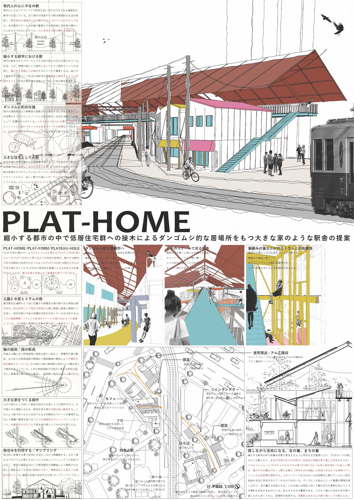 縮小する都市の中で低層住宅群に寄生するように存在する大屋根により、「大きな一つの家」のような駅となり、まるで日常のなかの何気ない生活ほど些細な寄り道と公共をもたらす。このようにふらっと(PLAT)よりみちできる家(HOME)のような安心感を孕むこの新しい駅は、煌びやかな集会でなく人間に必要な「共有された孤独」と形容できるような地味でジメジメした公共空間を提供する。このパッケージ化されない公共空間は人間にダンゴムシ的な自由な生活と存在を与えてくれるのではないか。ダンゴムシは自分にとって最適な環境を探しながら、石の裏をも住処とする。この土地には街区に対して軸のずれた建物が並ぶことで、不整形な余白が生まれている。私たちもまちの裏側である、この入り組んだ余白の中を寄り道しながら歩くうちに、居場所を発見する。本質的な大きな心の帰り場としての駅となる。