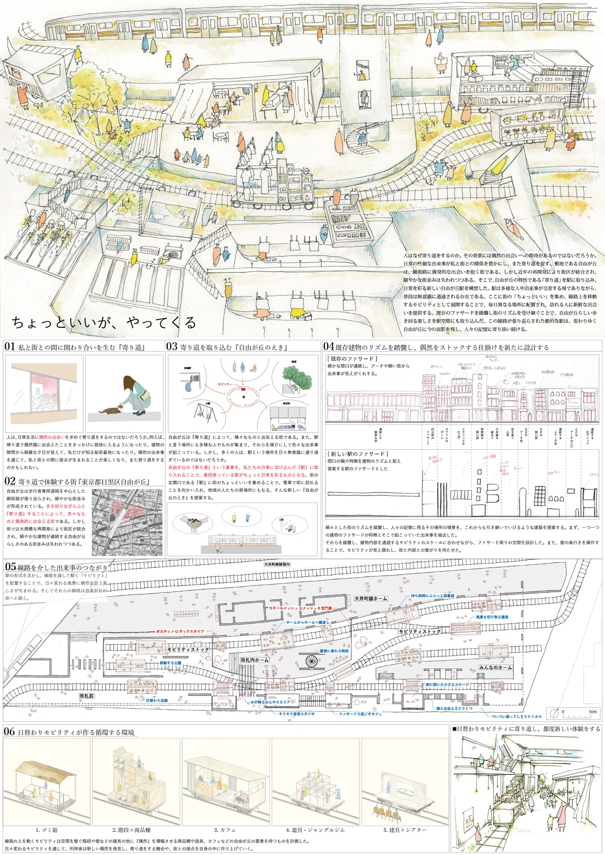 人はなぜ寄り道をするのか。その背景には偶然の出会いへの期待があるのではないだろうか。日常の些細な出来事が私と街との関係を豊かにし、また寄り道を促す。敷地である自由が丘は、細街路に偶発的な出会いを抱く街である。しかし近年の再開発により街区が統合され、細やかな街並みは失われつつある。そこで、自由が丘の特性である「寄り道」を駅に取り込み、日常を彩る新しい自由が丘駅を構想した。駅は多様な人や出来事が交差する場でありながら、普段は無意識に通過される存在である。ここに街の「ちょっといい」を集め、線路上を移動するモビリティとして展開することで、毎日異なる場所に配置され、訪れる人に新鮮な出会いを提供する。既存のファサードを踏襲し街のリズムを受け継ぐことで、自由が丘らしい歩き回る楽しさを駅空間にも取り込んだ。この線路が張り巡らされた動的な駅は、変わりゆく自由が丘に今の面影を残し、人々の記憶に寄り添い続ける。