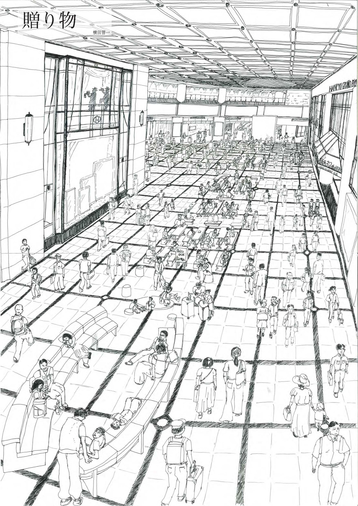 人が行き交う阪急梅田の大きなコンコース空間に、椅子と机を提案するという案だ。きわめて現実的、また安価ながら効果の大きさを期待できる提案で、その発想に大阪的なものを感じて、共感した。また、平面図もダイアグラムも用いずに、コンセプトを一枚の絵だけで表現するその単純さも、案の個性によく合っていて、評価された。