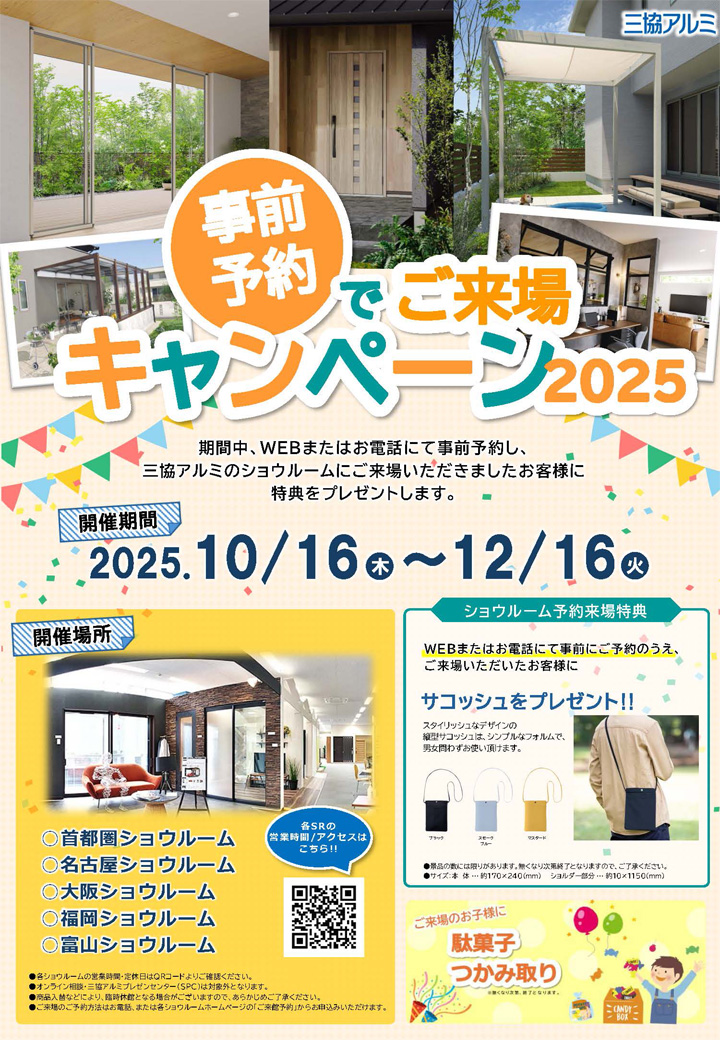 三協立山株式会社・三協アルミ社は、2025年10月16日から2025年12月16日までの期間、一般のお客様を対象に「事前予約でご来場キャンペーン」を開催いたします。