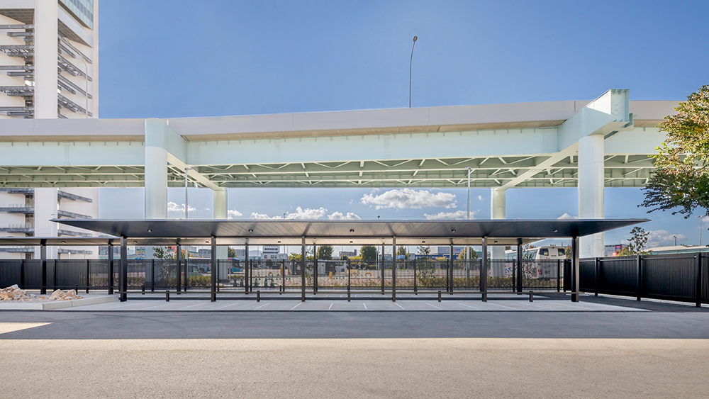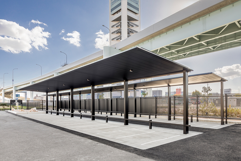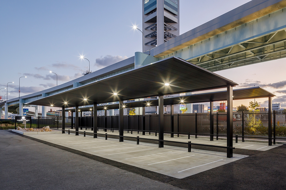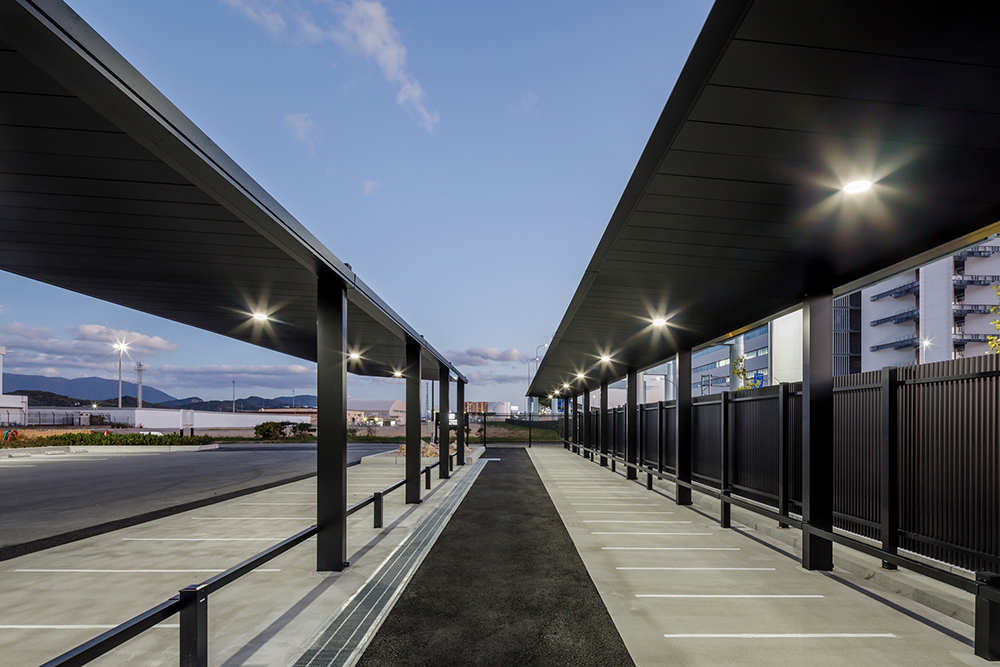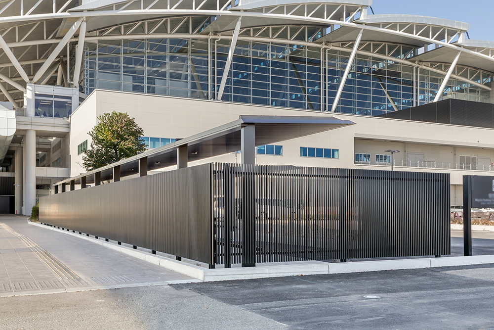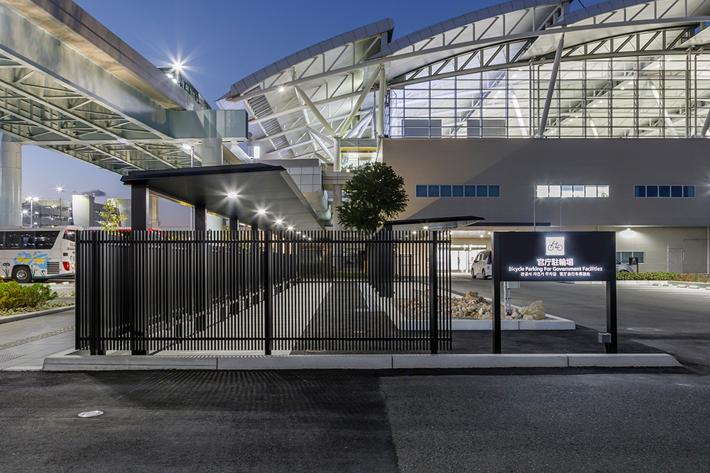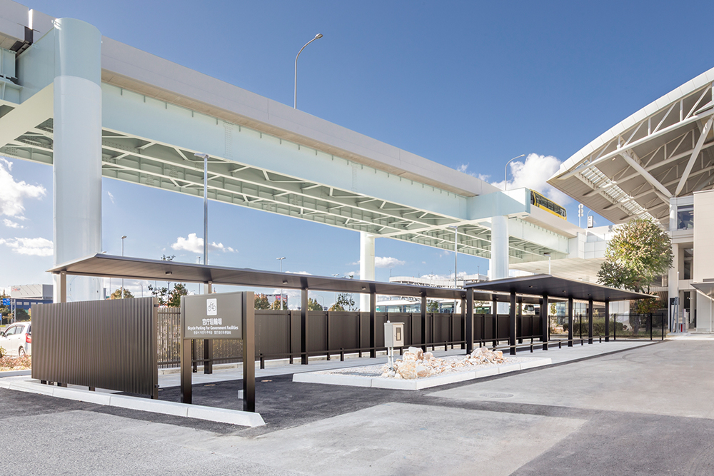 空港に設置されたサイクルポート「FUリンクロス」。ローレット加工の天井面が光の反射を抑制し、眩しさを軽減します。また、同じ黒色の大型フェンス「フレジスタ」で囲むことで、高級感のある駐輪スペースとなっています。「FUリンクロス」の専用照明は薄型であるためフラット屋根に溶け込み、夜間も快適にご利用いただけます。