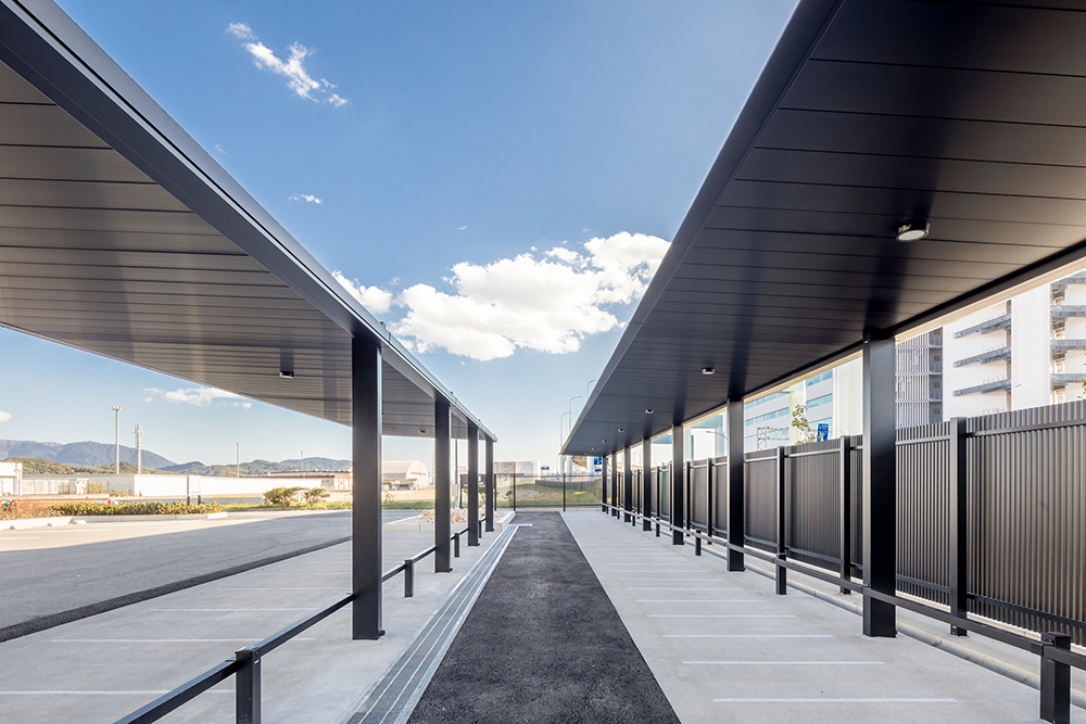 強風地域や積雪地域でもフラットな屋根デザインが際立つサイクルポートを