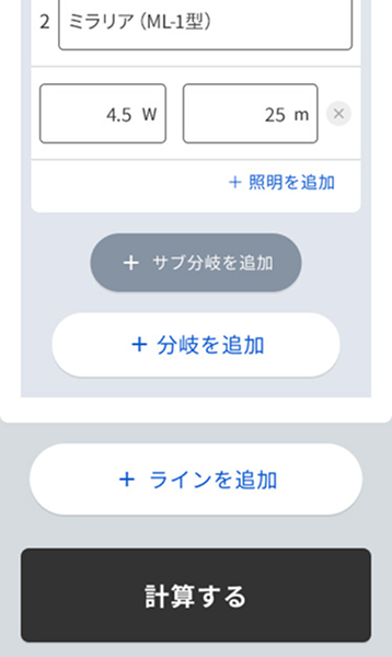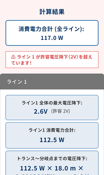 現場の条件から、電圧降下や設置可能距離・使用可能W数を算出します。