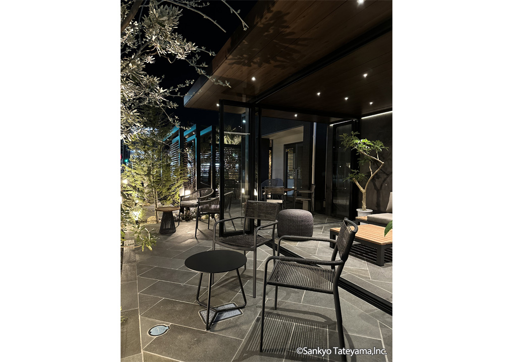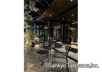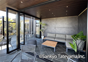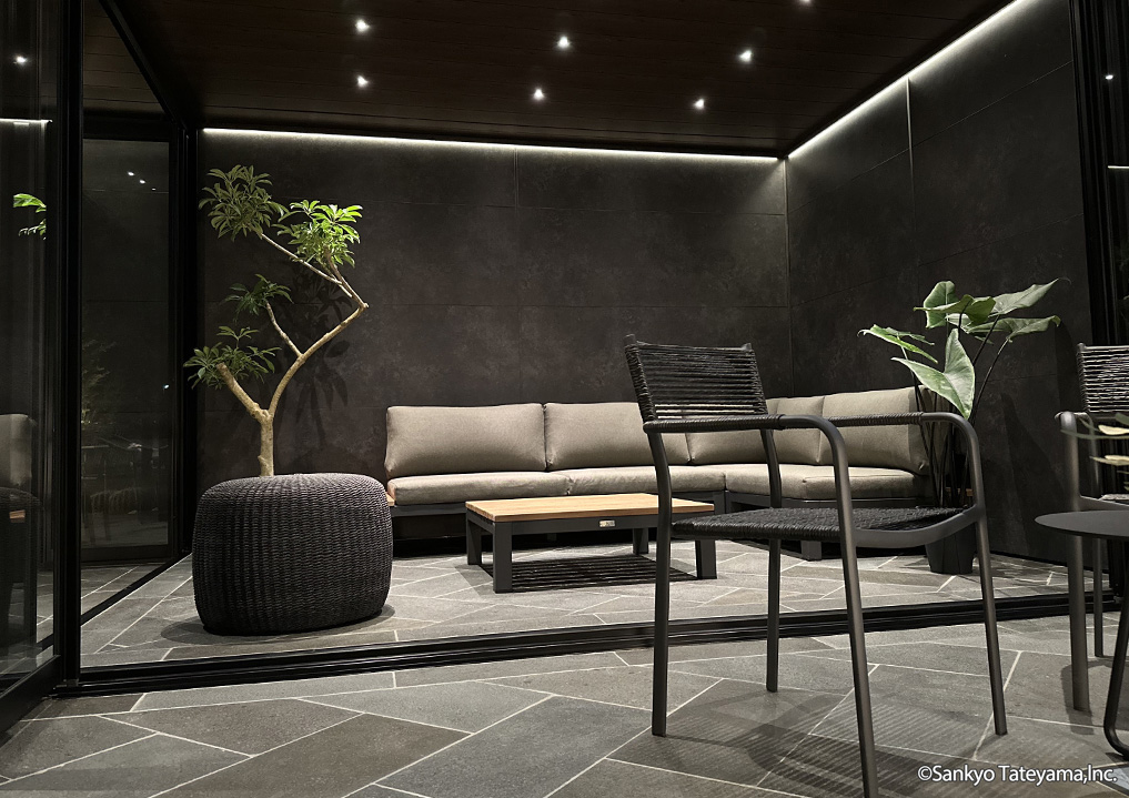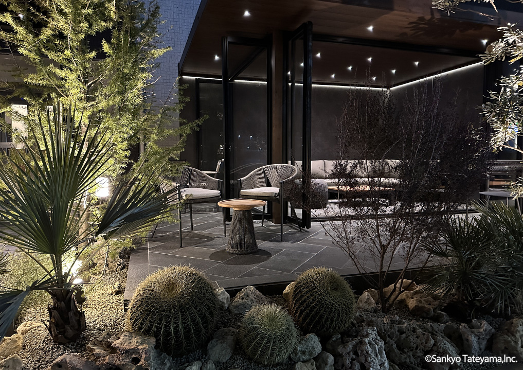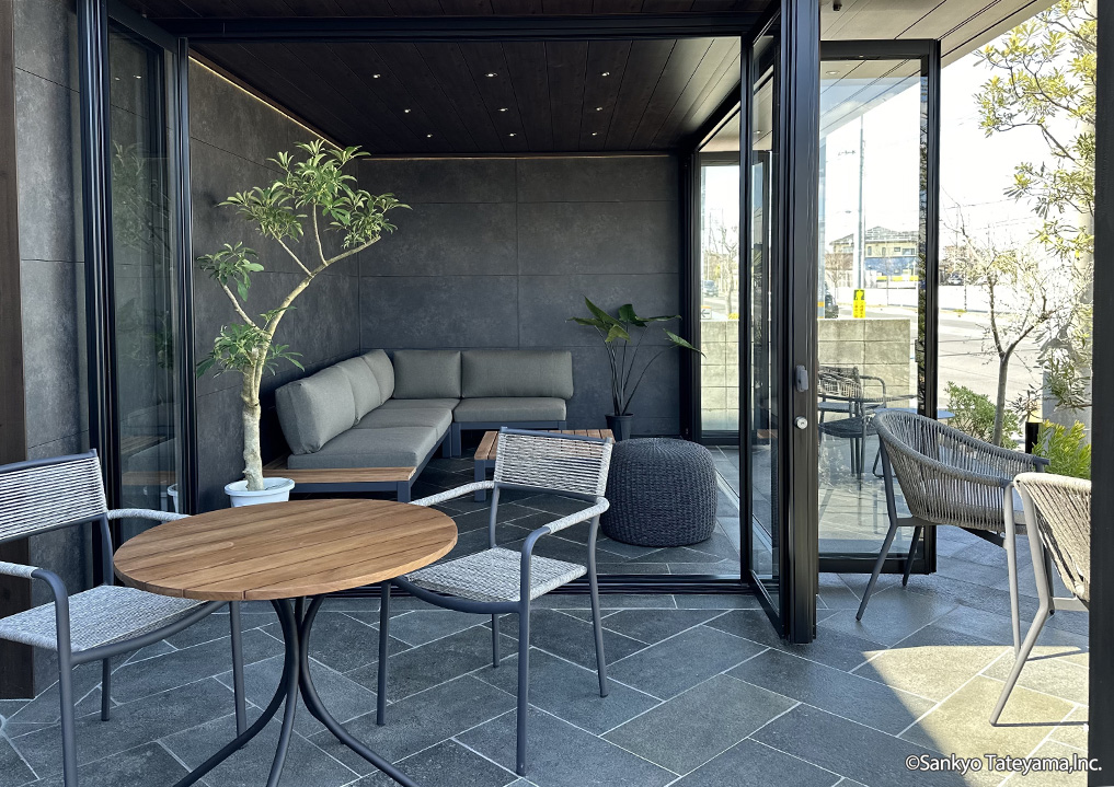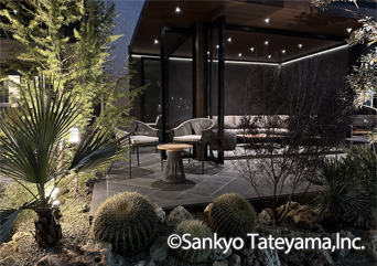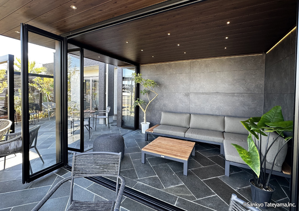 南国風リゾートをイメージさせる空間です。天井材と3尺の軒で晴れの日でも涼しげな印象に。エイジングメタル調の化粧ボードが洗練された雰囲気を醸し出します。夜は、ダウンライトとライン照明で落ち着いた空間を演出。
