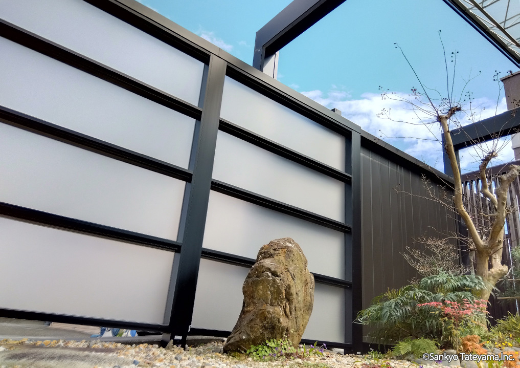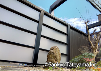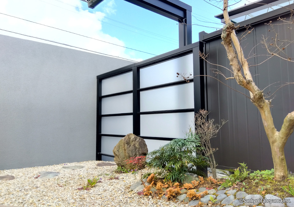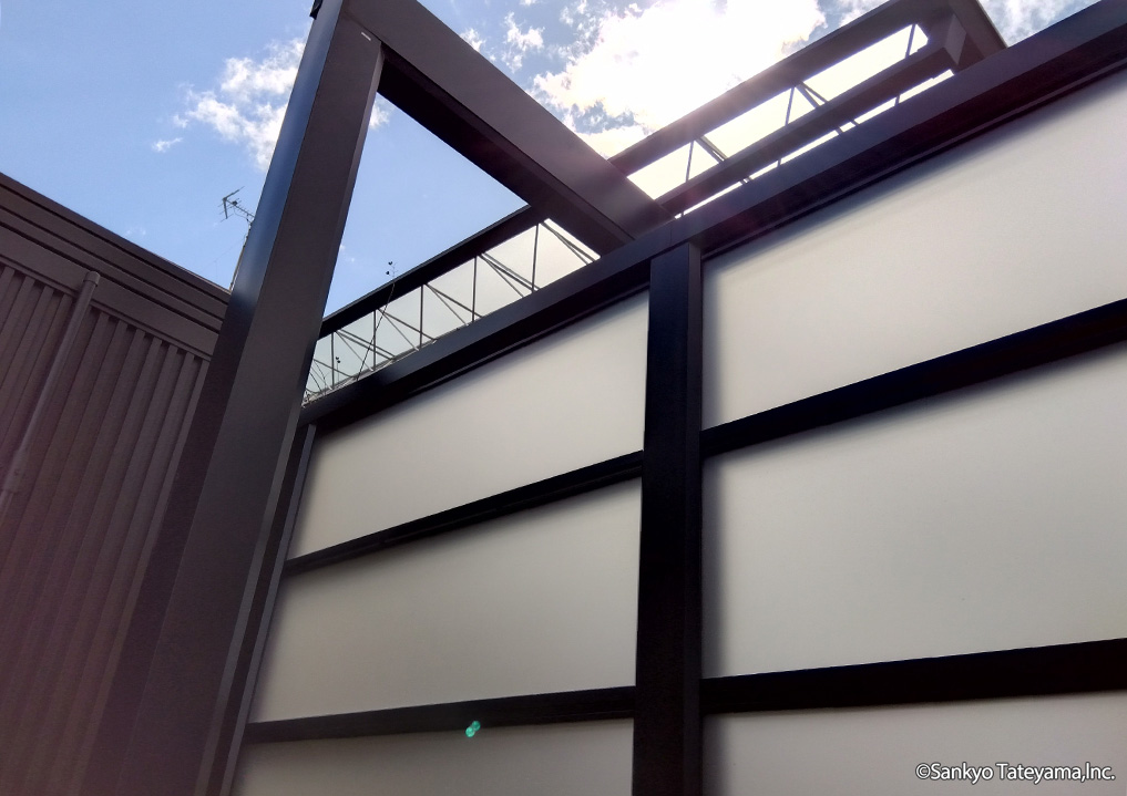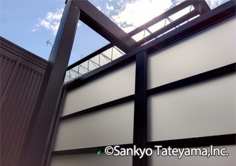 X.スタイル(1型)スクリーンを使用し、光を取り入れながら目隠しとして採用。X.スタイルの桁勝ち構造がM.シェードⅡの梁延長と上手く調和しています。