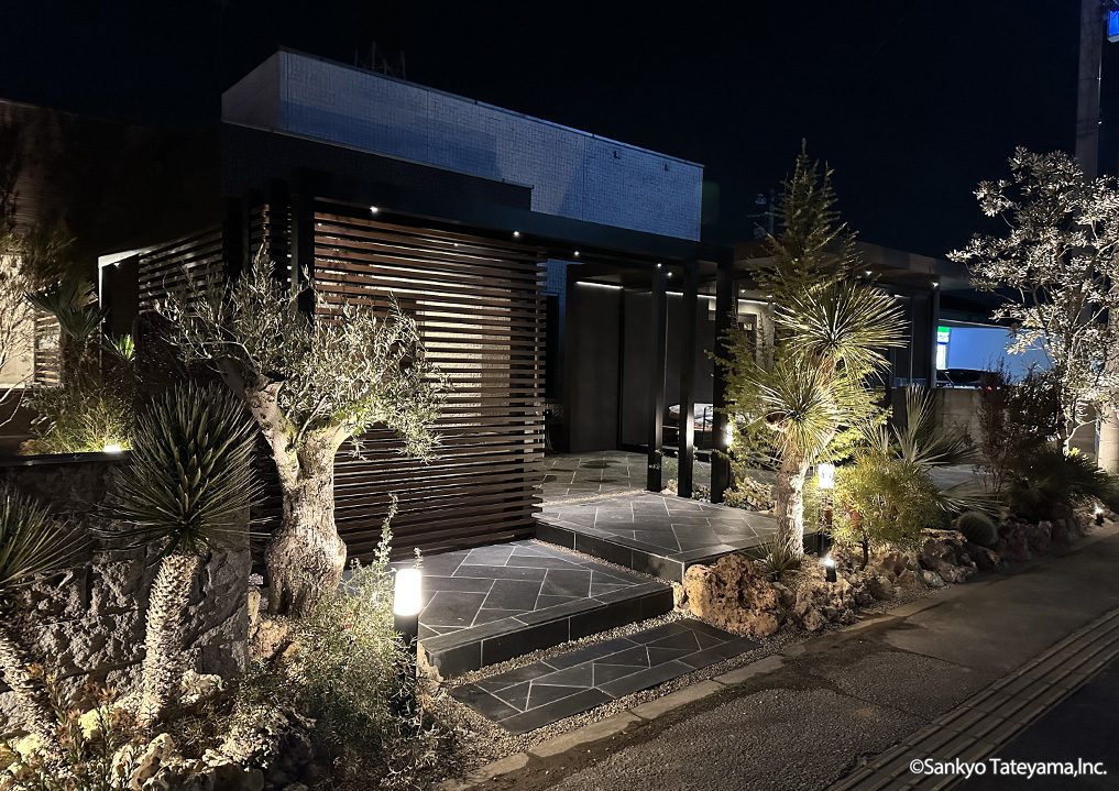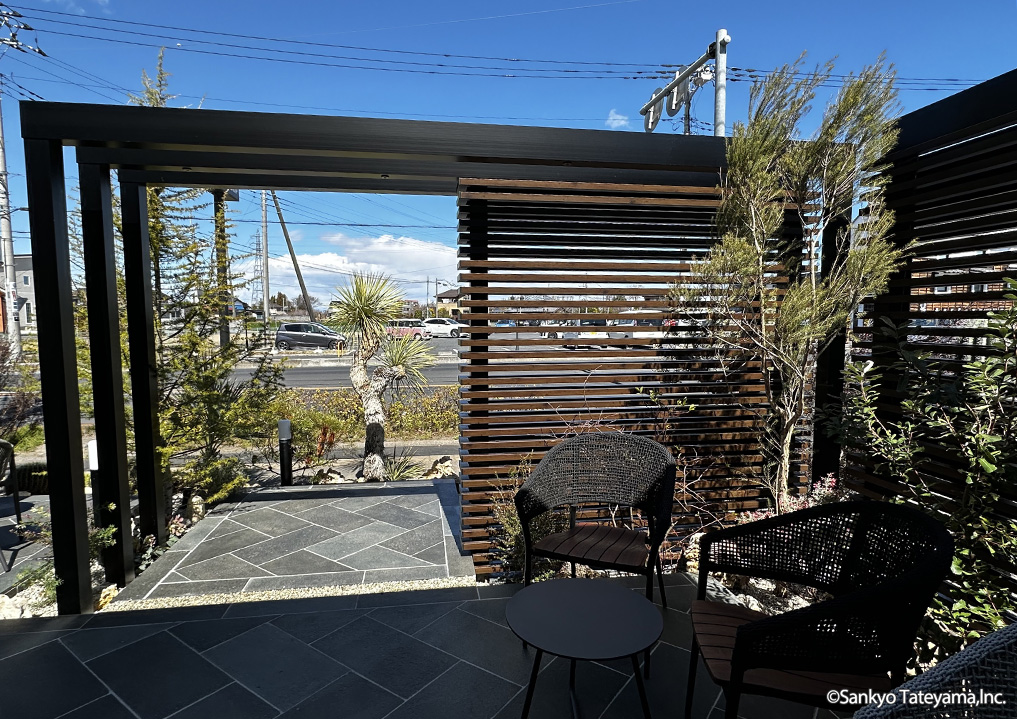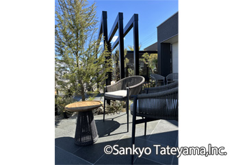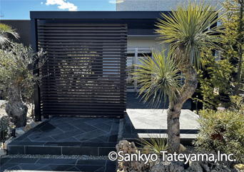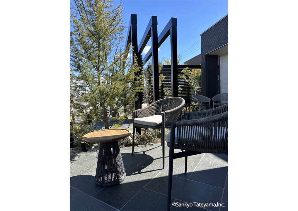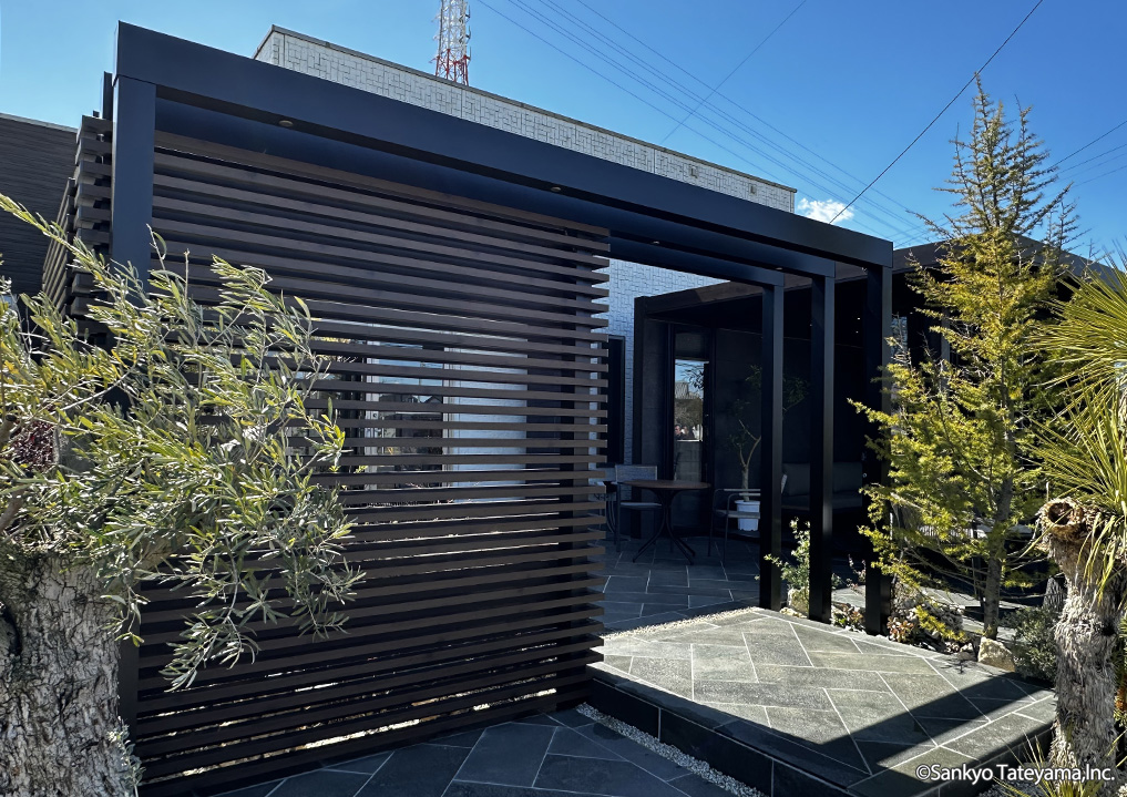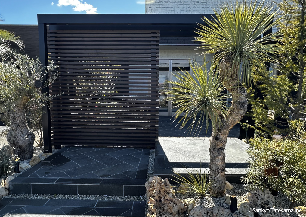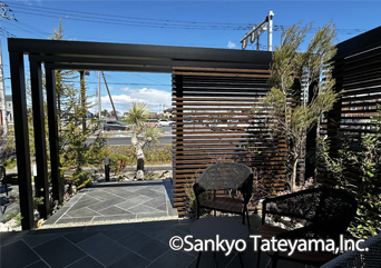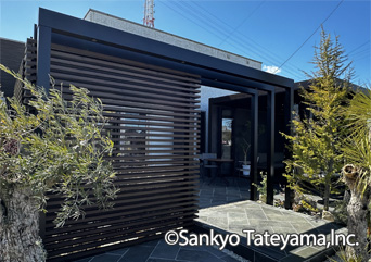 南国風リゾートをイメージさせる空間です。フレームをお客様を迎えるアーチとして使用しています。フレームを並べ、奥行き感を持たせることで門屋根にも見えるデザインです。
