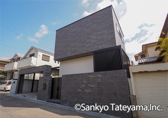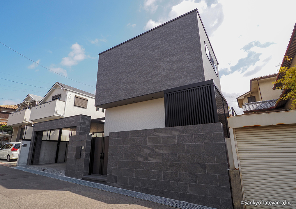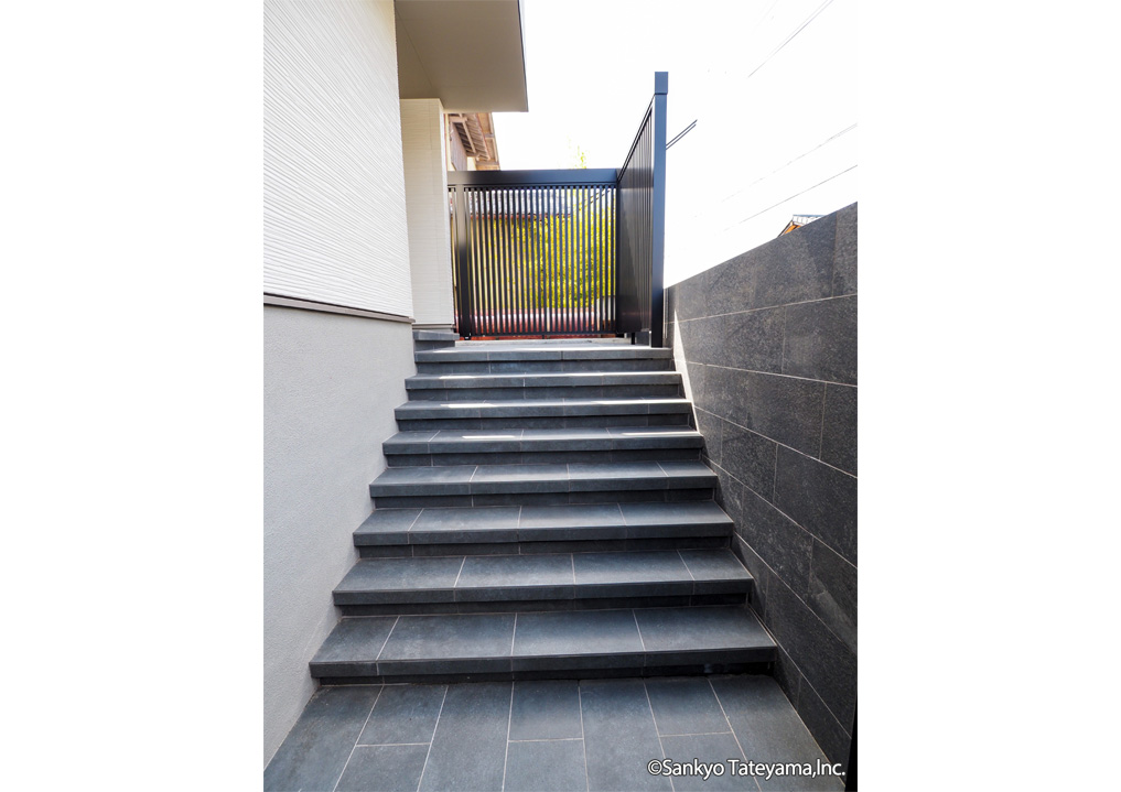 【品格高いグレーで統一したクローズ新築外構】 印象深い大判タイルが住まいの格式をアップ。 重厚感のあるクローズ外構でプライバシーも確保。 玄関前や勝手口前、リビング前のタイルデッキに目隠しスクリーンを設置しました。 様々な格子を組み合わせた意匠性の高いスクリーンで目隠しを実現。 タイルデッキはフルフラット工法でリビングの高さと同じ高さにし、プライベート空間で快適に過ごせるようにしました。