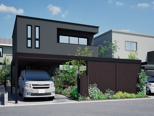 カーポート(プレミアムタイプ/間口側延長桁)/スクリーン(5型)/機能ポール フレムスLight:サイドスクリーン付き(たて格子タイプ)/ヴィラウッド(人工木幕板タイプ)/ジーエムラインWフェンス (横桟タイプ)/シャトレナⅡハイタイプ(1型)/フォレスティ(ローテーブル/2シーターソファ)