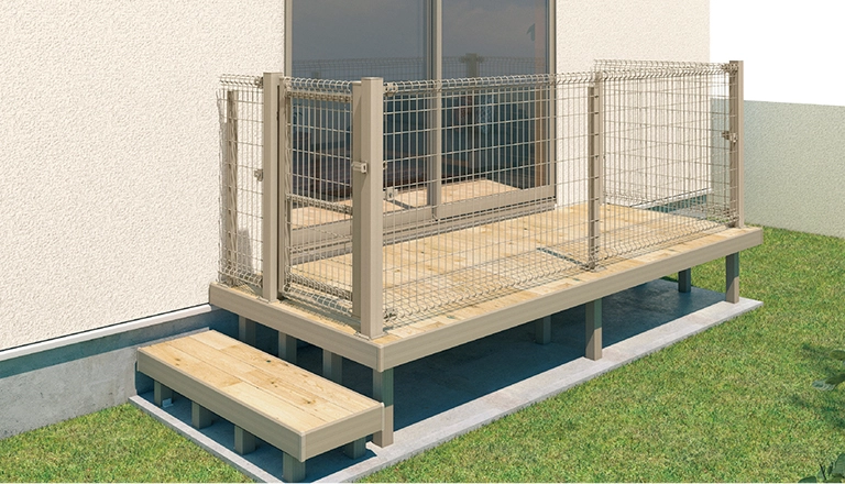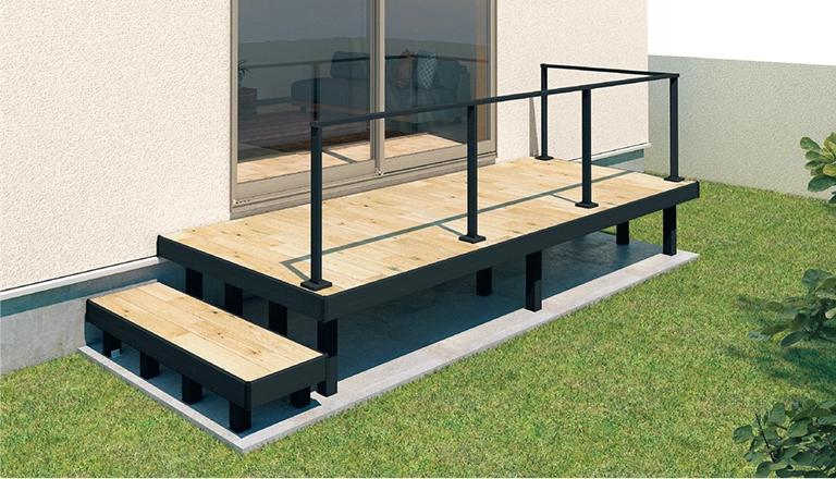 室内フローリングのトレンドに合わせた145mmピッチの床材が、室内の心地よさをそのまま外へと繋げます。