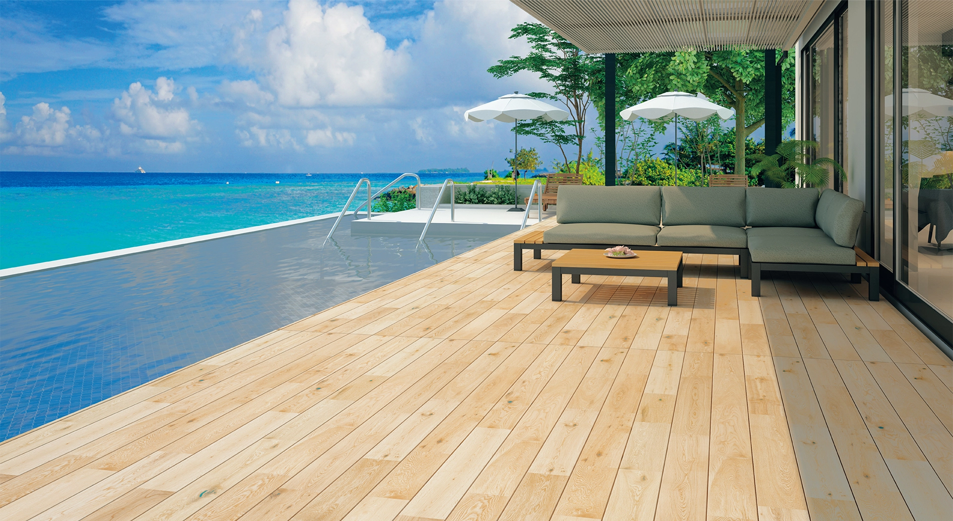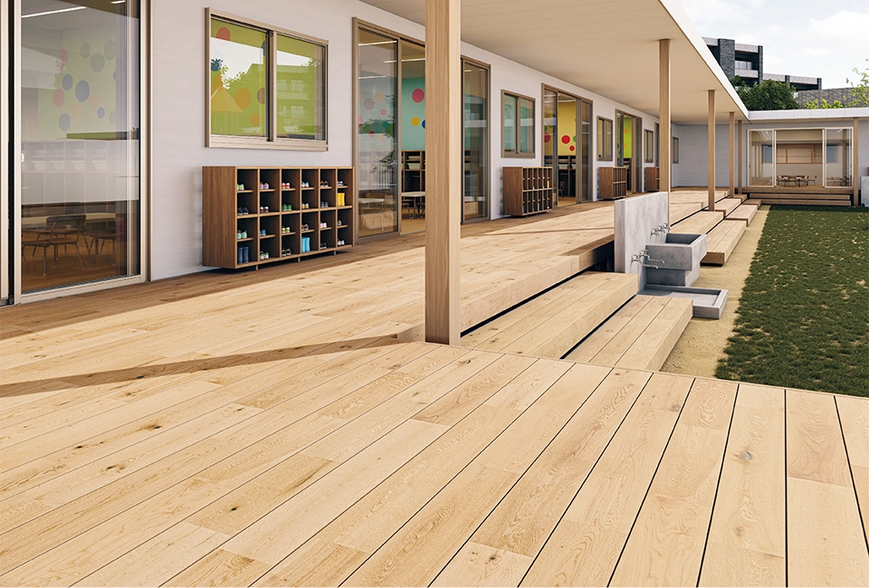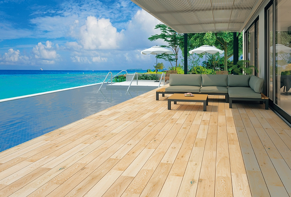 室内フローリングのトレンドに合わせた145mmピッチの床材が、室内の心地よさをそのまま外へと繋げます。