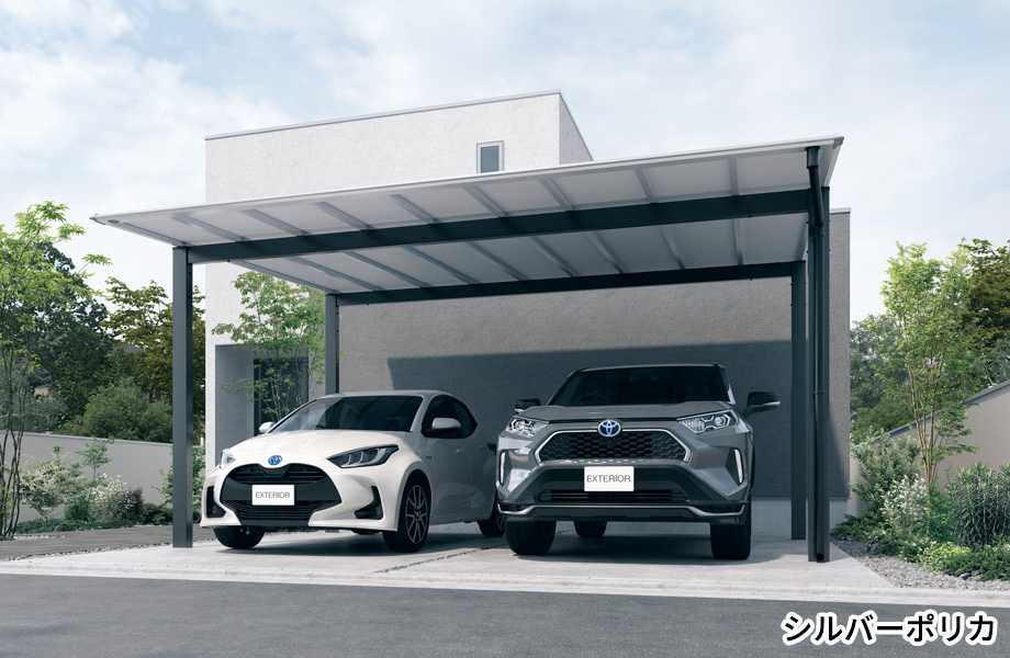 屋根をサンシルバー、柱・梁がブラックのコントラストで屋根が軽快に見えカーポートが主張しすぎずナチュラルな印象に。