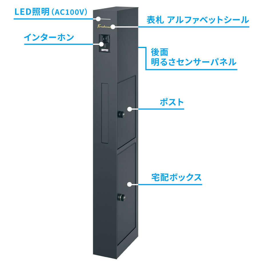 スリムなポールに照明内蔵タイプや宅配ボックスあり・なしタイプなど充実したラインアップ。