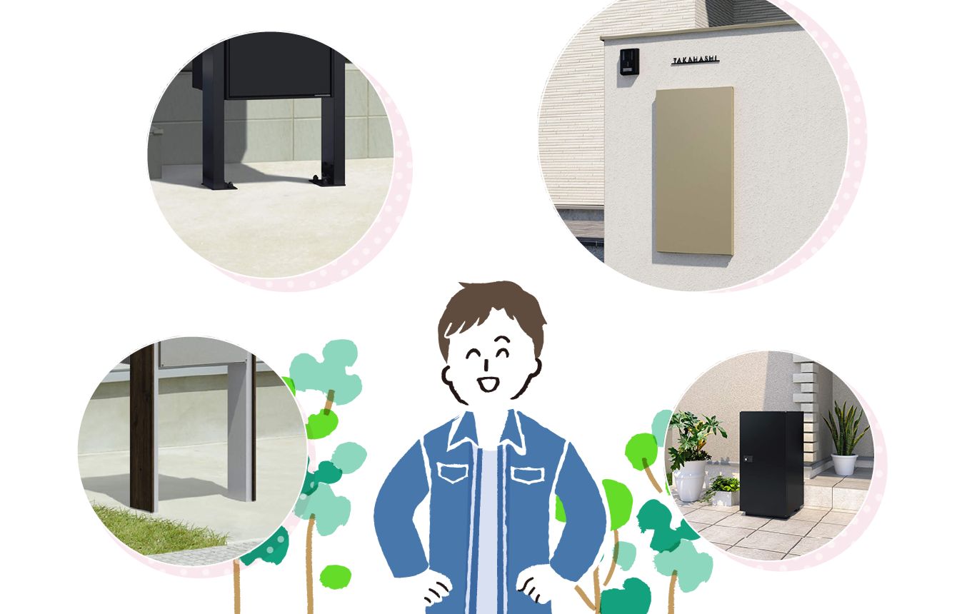 新築時におすすめの塀に埋め込む「埋め込みタイプ」や、土間に埋め込む「ポール埋め込みタイプ」の他に、既存の土間に取り付け可能な「ポールベースプレートタイプ」、短時間で設置可能な「据え置きタイプ」などお家の状況に合わせて設置方法が選べます。