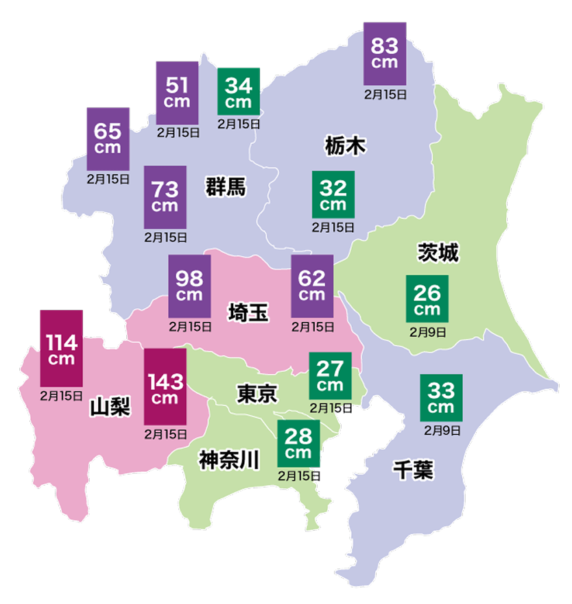 甲府114cm、河口湖143cmなど各地で観測史上1位を大幅に更新しました。