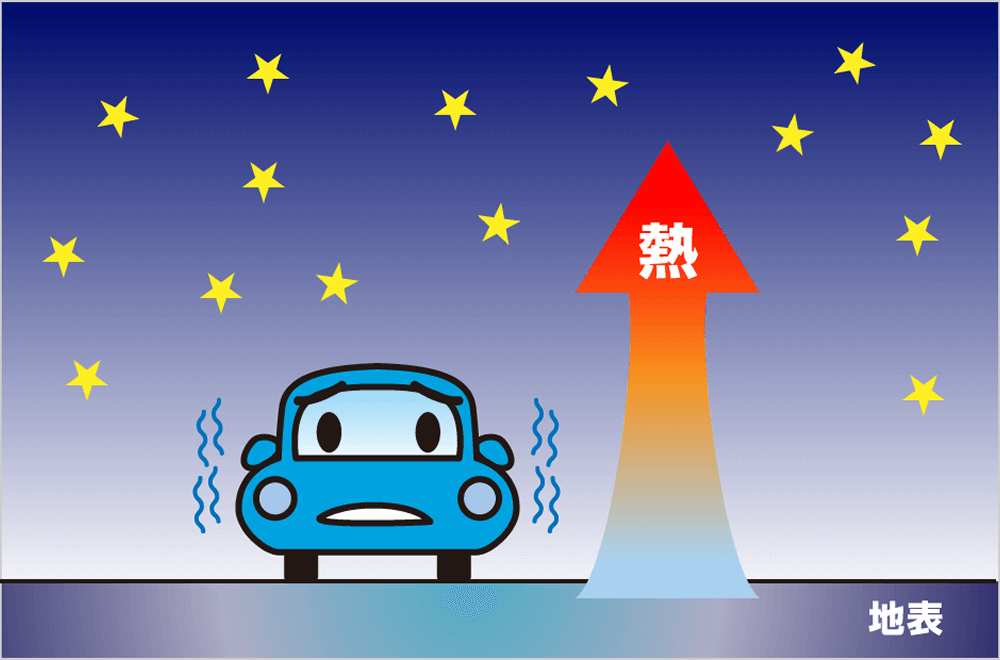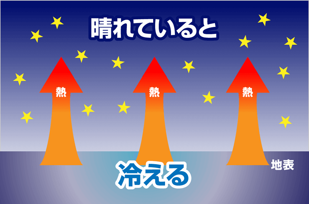 地球の地面は常に熱を宇宙に放射していますが、昼間は太陽からの熱の方が強いので、気温が上がります。でも夜は、太陽からの熱がなくなって地面から熱の放射が続きますので、気温が下がります。これが放射冷却という現象です。