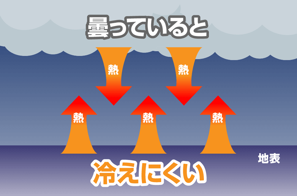 実は、雲が多い夜は、気温はそれほど下がりません。これは、地面から放出された熱を雲が吸収し、熱の一部を放射するからです。