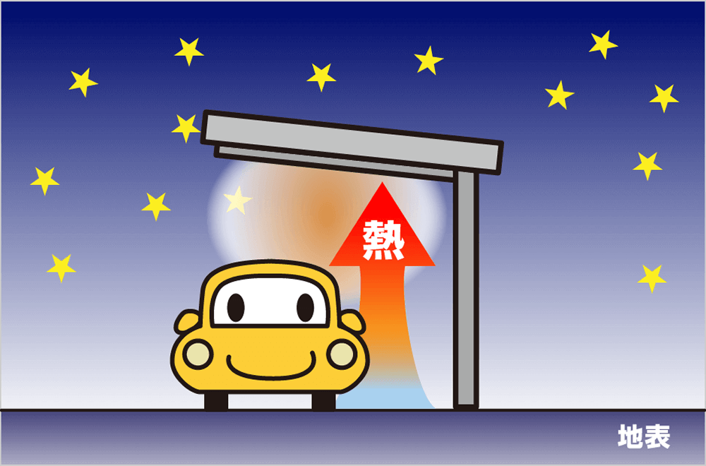 カーポートを設置すれば、雲の代わりに地面から放出された熱をカーポート内にとどめるので、霜の付着を抑えてくれます。