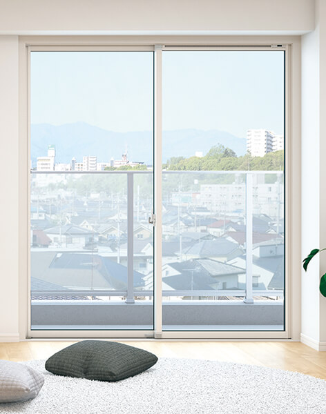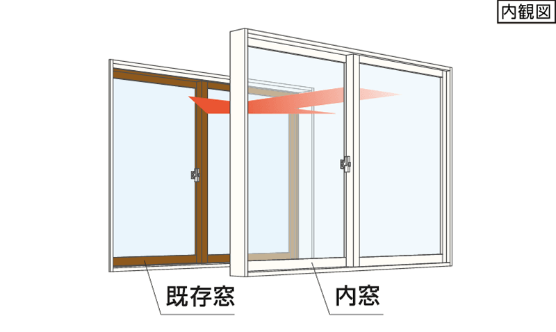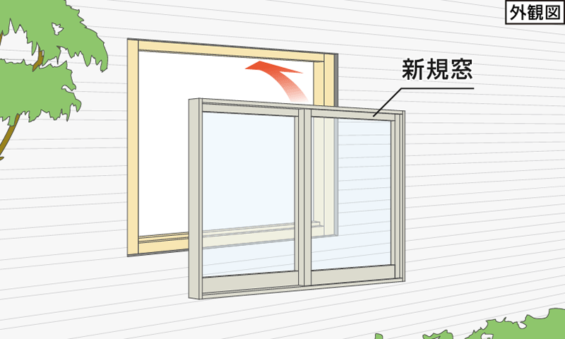 既存窓のガラスを取りはずし、既存窓枠の上から新たな窓枠を覆い被せて取り付け、複層ガラスなどに交換