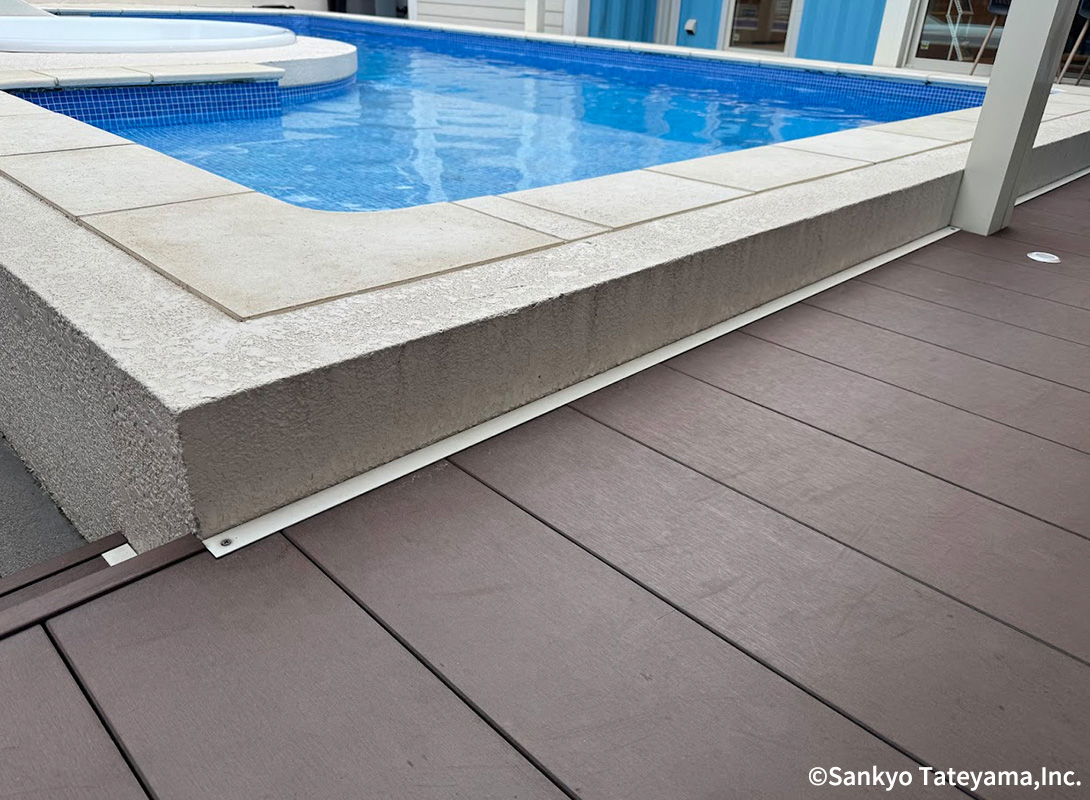 「人工木デッキは、タイルよりもフルフラットに施工しやすく、床面に傾斜を取らなくても目地から排水できるのがいいですね。それに足元が平らだと、犬の歩行ストレスが軽減されるんですよ。雨の不快感も少ないですし、天然木と違ってメンテナンスが楽なのも助かります。」と岡本様。
