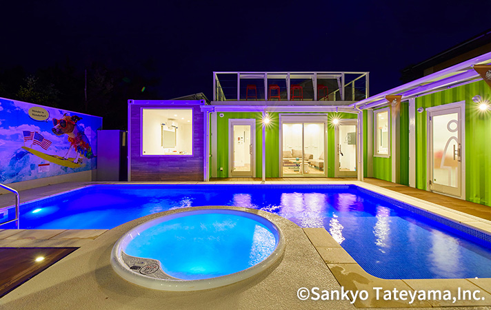 犬と泊まれる宿泊施設のなかでも注目を集めているのが、プライベートヴィラ型の施設です。「f.f.Vacation House Green」は眺望を活かしたバルコニーや、ナイトプールにもなる屋外プール、天候を問わず楽しめるデッキテラスでのバーベキューなどアウトドアライフはもちろん、ジェットバス、サウナ、カラオケもできるシアタールームなど、リラクゼーションやアミューズメントの設備がそろっています。