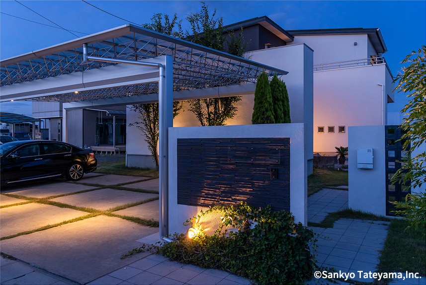 「せっかくなら、やっぱり妥協せずにいいものをと思って」と奥様。家の外壁と柱のラインをずらさずに設置することで、後付けとは思えない一体感が出て上品な仕上がりに。建物のモダンな雰囲気に溶け込み、まるで最初から設計されていたかのような存在感を放ちます。