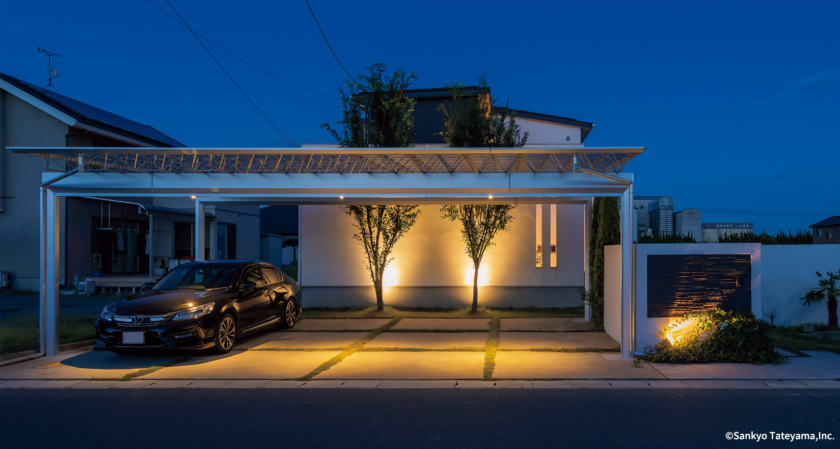 「暗いと、ちょっと物を落とした時などに見えづらかったんです」と真っ暗な駐車スペースに不便さを感じていたご主人。『M.シェード』にはライトを設置し、暗い中での車の乗り降りも安心で、暮らしに心強いあかりを添えています。