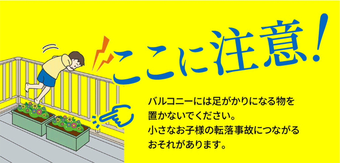 お子様がバルコニーに出るときは必ず大人が付き添い、決して目を離さないようにしましょう。日頃からお子様が手すりにつかまって遊ばないよう、十分に注意してください。