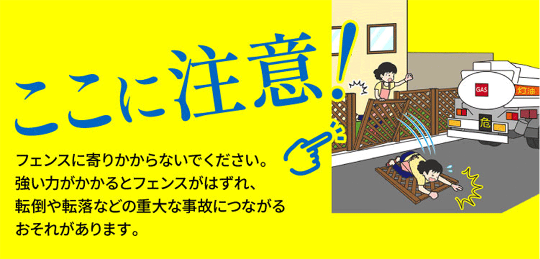 フェンスは、敷地や隣地との境界を区切るためのものです。 転落防止柵ではありませんので、無理な力をかけるとフェンスがはずれ、人の転倒や転落事故につながるおそれがあります。
