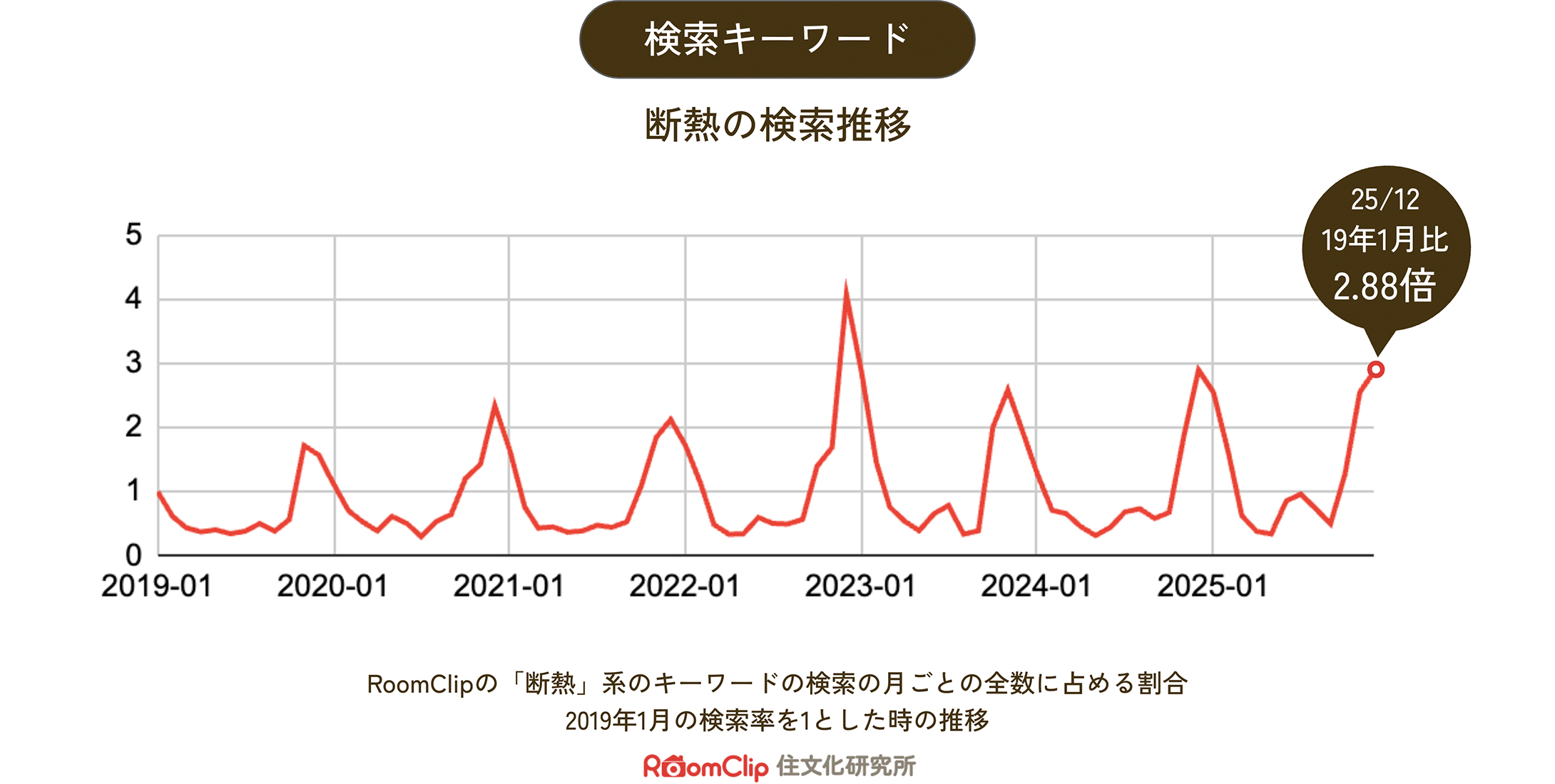 上図は、RoomClipにおける「断熱」系のキーワードの検索推移を表したものです。最大のピークである冬の検索数については、2019年1月と2025年12月を比較すると約3倍になっています。また、2023年からは夏にも検索数が顕著に増加しており、第二のピークが見られます。