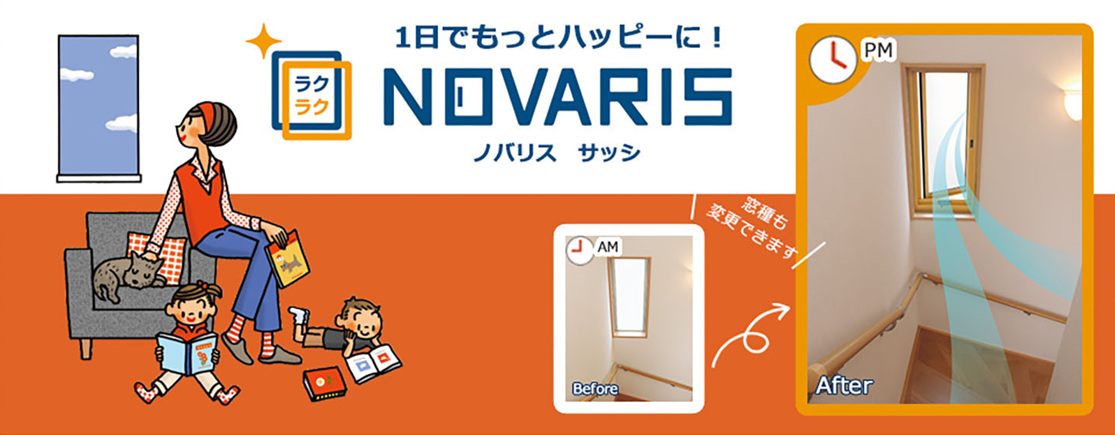 カバー工法とは、外壁を壊すことなく、今ある窓枠の上から新しい窓枠をかぶせるだけのスピーディ施工で、最新の高性能窓にリフォームすることができる工法です。複層ガラスを採用した「ノバリス サッシ」なら、ガラスとガラスの間の空気層が高い断熱効果を発揮し、お部屋を快適に保ちます。樹脂アングルで、温度差による結露の発生も抑えます。