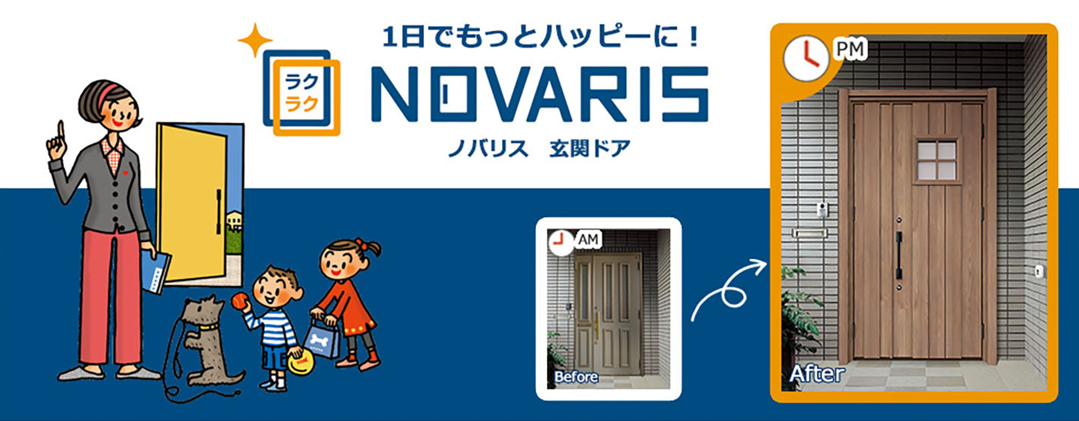 スキマ風が気になる玄関ドアをリフォームすることで、廊下や階段の冷え込みを防ぐことができます。「ノバリス 玄関ドア」なら、カバー工法で1dayリフォームを実現。「高性能断熱仕様 Fクラス」では高性能断熱パネル、気密性を高めるタイト材、Low-E複層ガラスを採用しています。